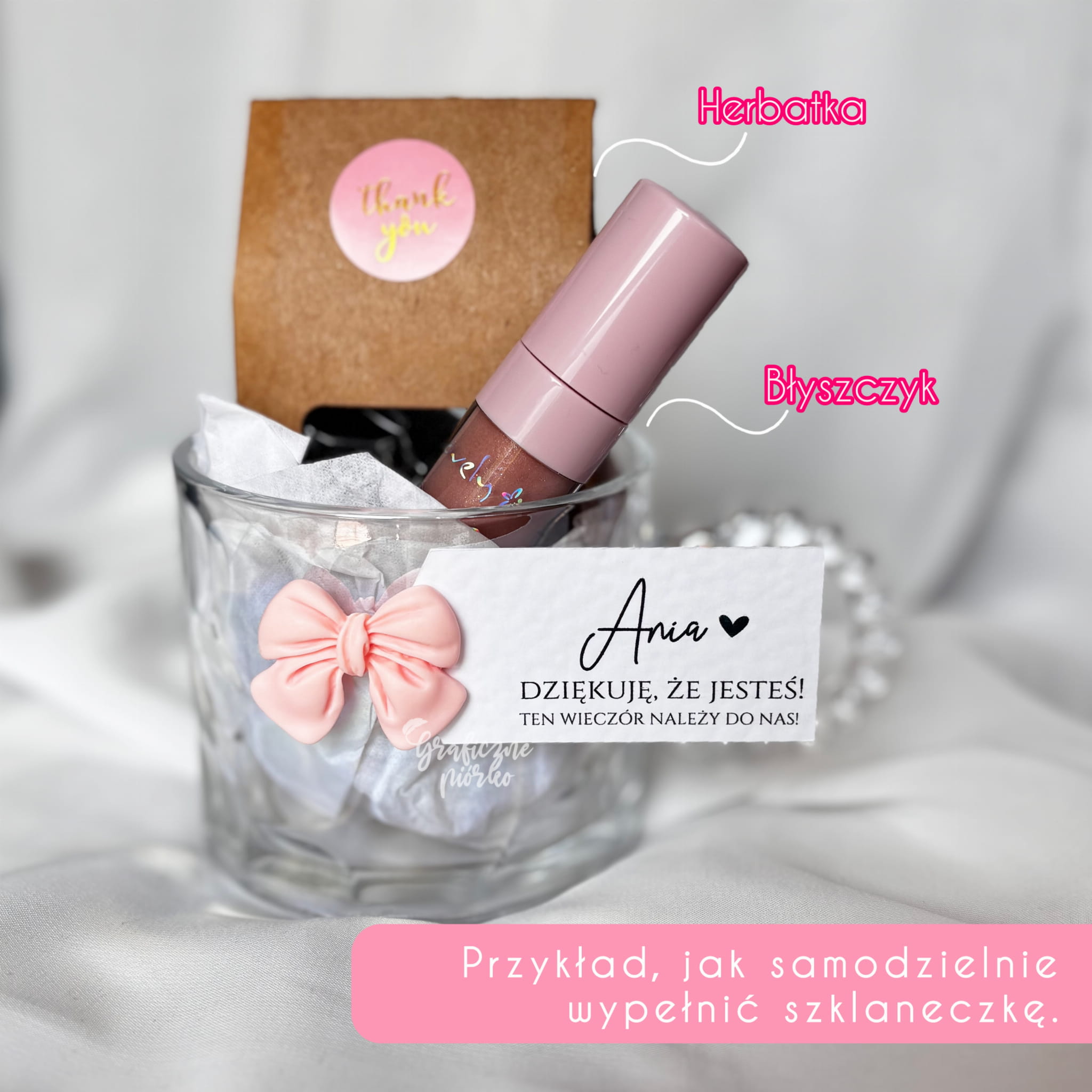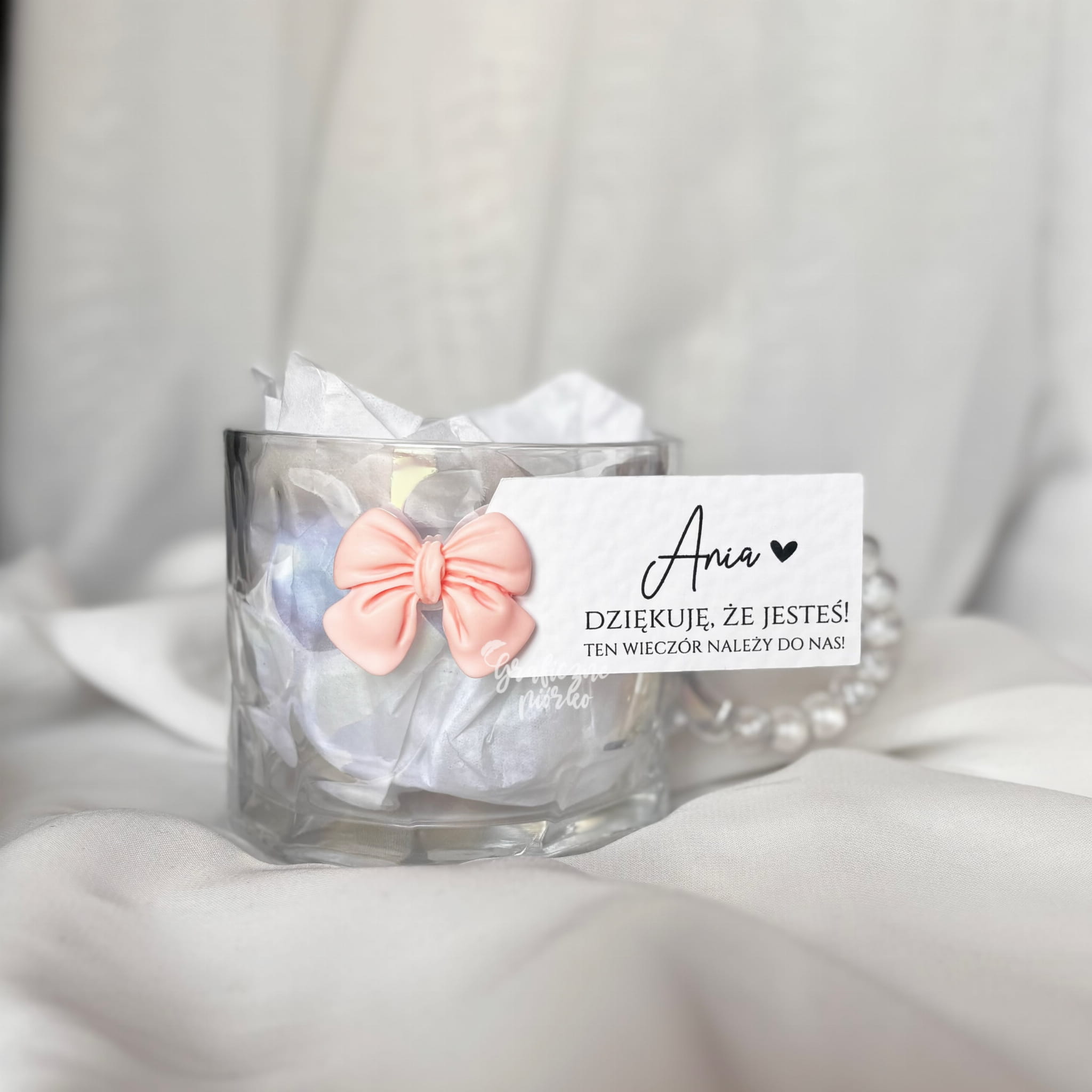 Nasz delikatny, szklany kubeczek z uroczą kokardką to nie tylko piękna pamiątka, ale również stylowy prezent, który możesz samodzielnie uzupełnić o ulubioną herbatkę, kosmetyk, czy słodkości.